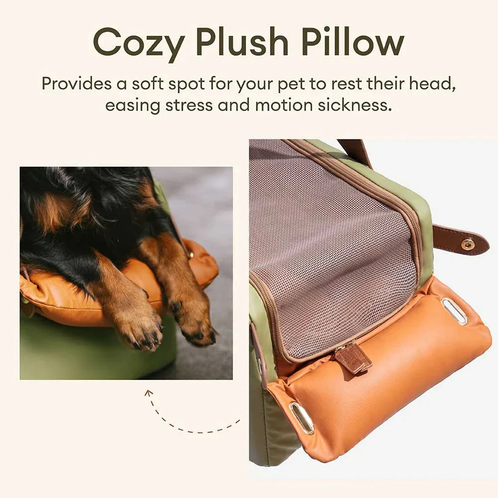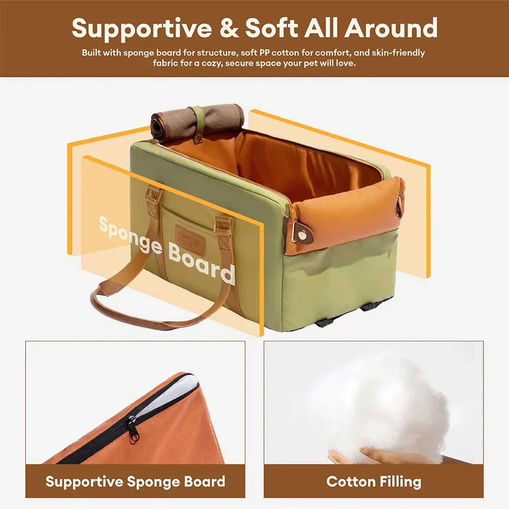 Comfort & Supporto Premium: Interno completamente imbottito con una finestra in rete traspirante e un poggiatesta integrato—perfetto per alleviare l'ansia del tuo animale domestico e ridurre il mal d'auto. Il cuscino anteriore può essere ripiegato in giù o in su per un riposo o supporto flessibile.